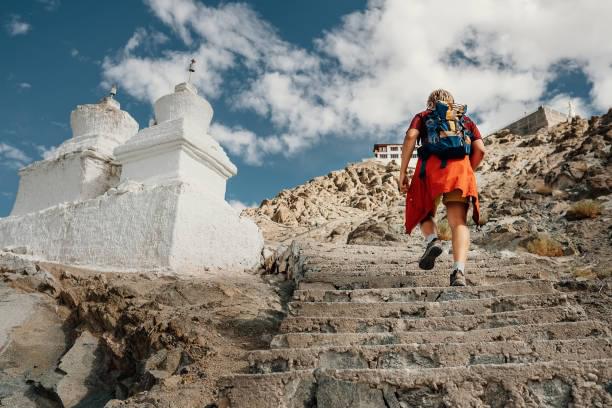 Tourist man climbs up stairs to tibetan holy place in Himalaya mountain